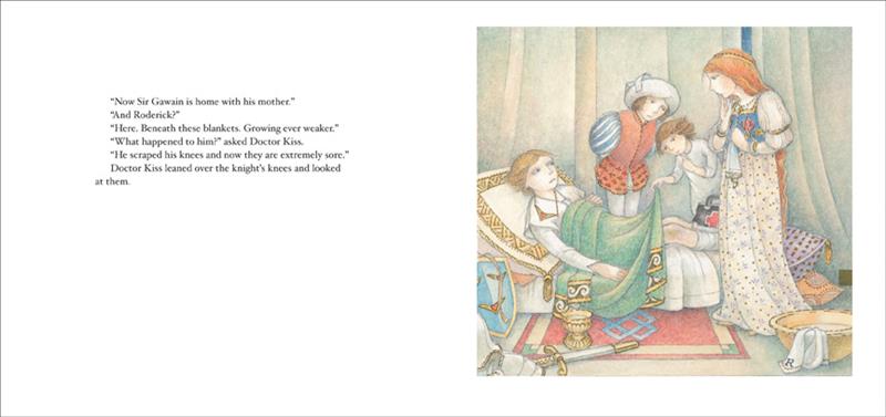 Doctor Kiss is quite prepared to say yes when she finds a letter asking her to come to the aid of a young knight who has been injured in battle. She waits until after her usual goodnight kisses and hugs from her parents, and then she takes her medical bag and climbs through her bedroom window into a gilded, magical world from the age of chivalry.